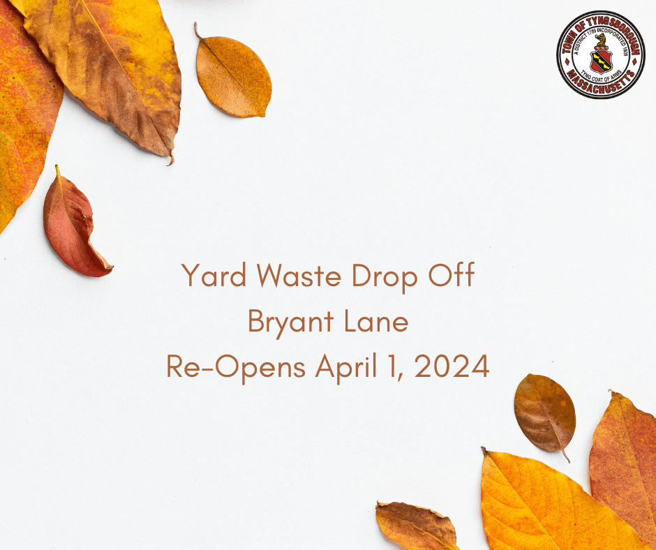 The Town of Tyngsborough will reopen the Yard Waste Drop Off Site located on Bryant Lane on April 1, 2024. The site offers a no-cost drop off location for residents to leave yard waste at their leisure. The site is monitored by surveillance cameras and strictly off-limits to contractors or for commercial waste.